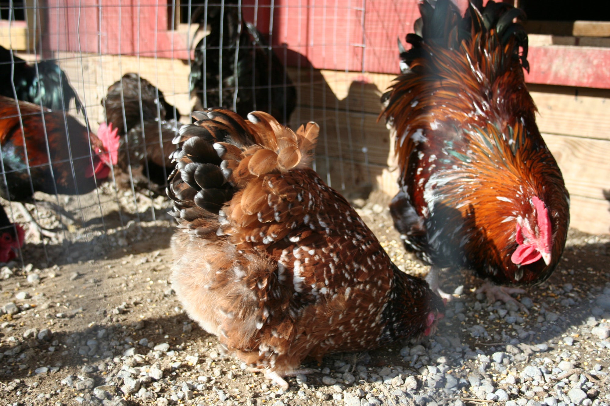 Jubilee Orpington is a British line of chicken that is a rather rare breed here in the US, there is currently only a few farms that offer this wonderful bird. The Jubilee Orpingtons are a very large breed and a prolific layer, they lay a large cream-colored egg, they have a deep Mahogany colored body with ruby, emerald, and white flecks. The beautiful Jubilee coloring has been described as the springtime sun melting the snow from a winter hillside, I think that fits perfectly. Jubilee Orpingtons are a very gentle calm bird. Jubilee chicks start out as yellow fluff balls and quickly develop their coloring. If you're like me and you like big butts on your poultry, the Orpington is for you. The Jubilee is the size of a nice big beach ball. Our Jubilees are English.